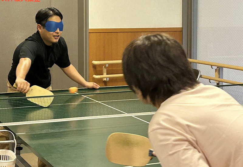 STTは、鈴の入ったピン球を鈴の音を手掛かりに互いに打ち合い、勝負を競います。中西ゼミ生はアイマスクを着用し、視覚障害者との打ち合いに興じました。中西ゼミにとって、日ごろ経験することのない光のない世界において音だけを手掛かりに判断する経験は貴重なものだったようで、今までとは違った感覚を得た様子でした。