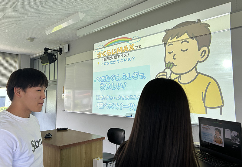 経営学科・中西ゼミの3年生が、桜峰小学校の子どもたちが育てた桜島大根を素材にしたスイーツを考案。Zoomでつながった子どもたちに提案しました。