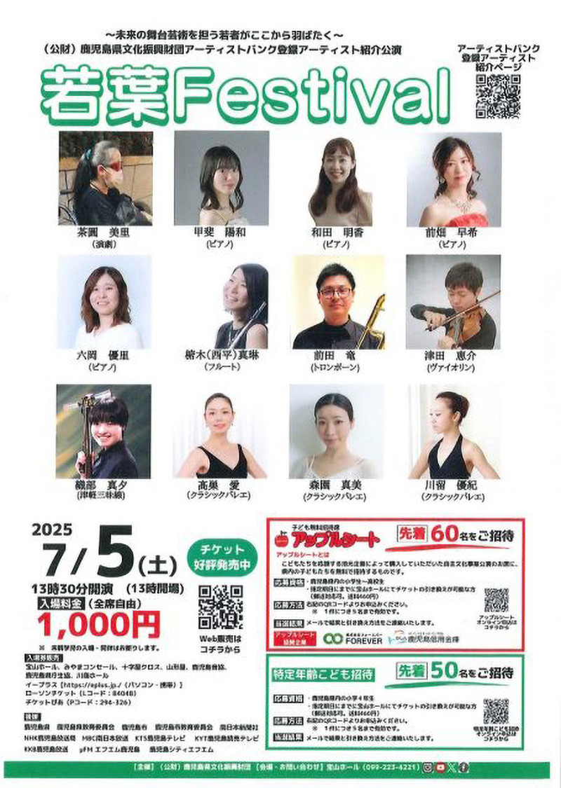 (公財)鹿児島県文化振興財団アーティストバンクに新規登録された演奏家たちを紹介する「若葉Festival」が7月5日(土)、宝山ホール(鹿児島県文化センター)で開催されました。今年度のオーディションに本学在学生で合格したのは甲斐陽和さん(ピアノ課程4年)で、日ごろの真摯な取り組みを披露しました。
