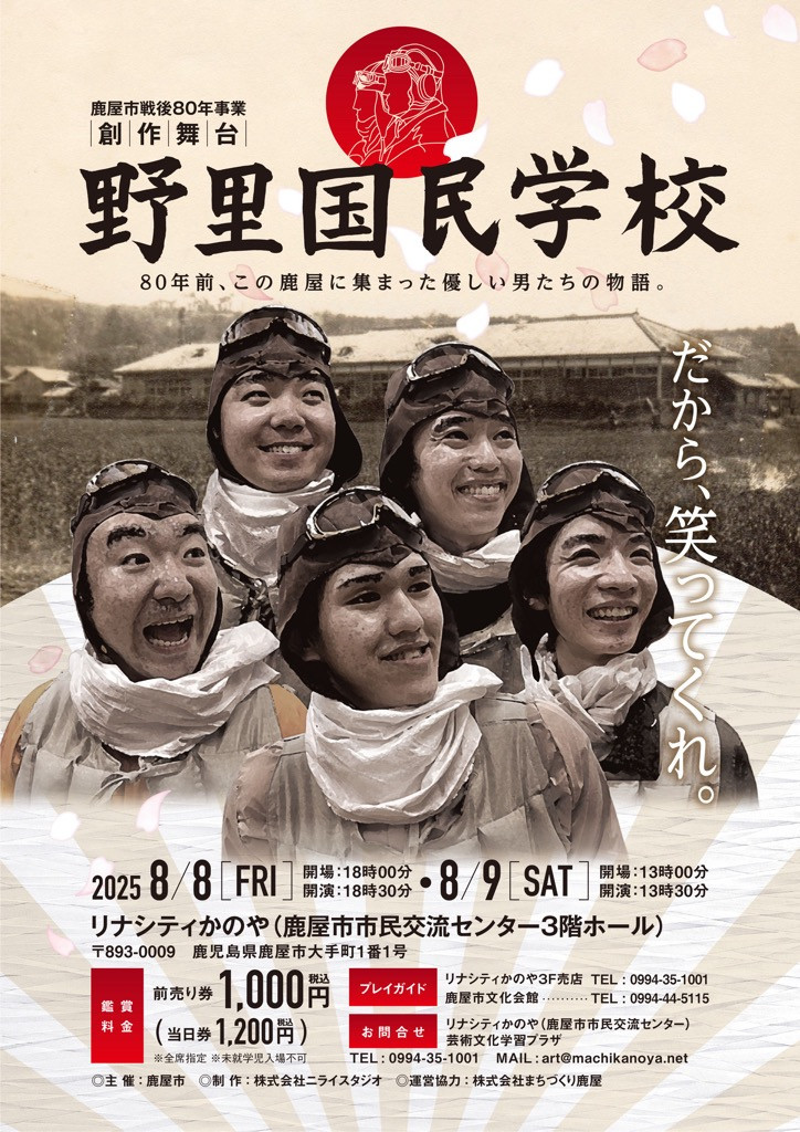 戦後80年の節目を迎えた今年、国内で最も多くの特攻隊犠牲者を出した鹿屋市は数々の周年事業を行っています。その一環として開催された創作舞台「野里国民学校」(台本・監督・音楽:松永太郎)に、音楽学科卒業生の村山創太さん(令和6年度卒業/バリトン)が主役級の一人として出演しました。野里国民学校は旧野里小学校の校舎を借りて設けられた寄宿舎で、全国から集った特攻志願兵たちが出撃命令を待ちながら、最後の時を過ごした場所。村山さんは従軍記者として随行した作家 山岡荘八を演じ、中立的な立場から戦況や志願兵を見つめながら、戦争の悲惨さと平和の尊さを訴えました。
