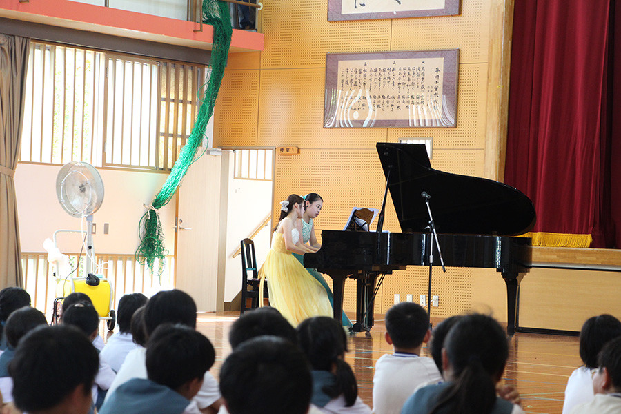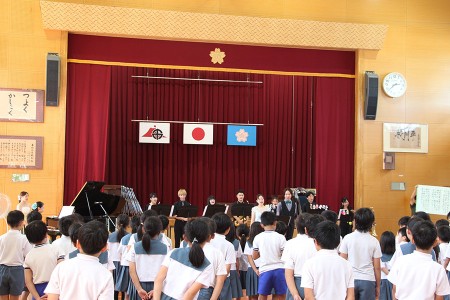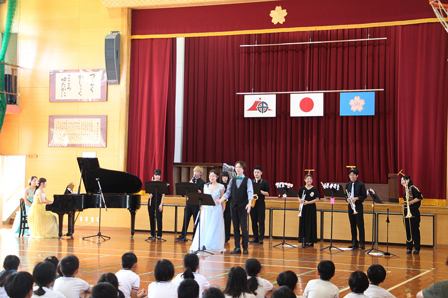 当日は猛暑の中での演奏となりましたが、児童たちは普段近くで見ることのできないさまざまな楽器に興味津々で、演奏者のドレス姿にうっとりしたり、生の歌声の迫力に驚いたりと、45分間のプログラムに没頭していました。また、最後には野田かつひこ作曲《枇杷の実が育つように》を出演者、児童、教員で一緒に歌うことにより、みんなで音楽を作り上げる楽しさも共有することができました。