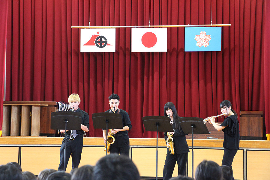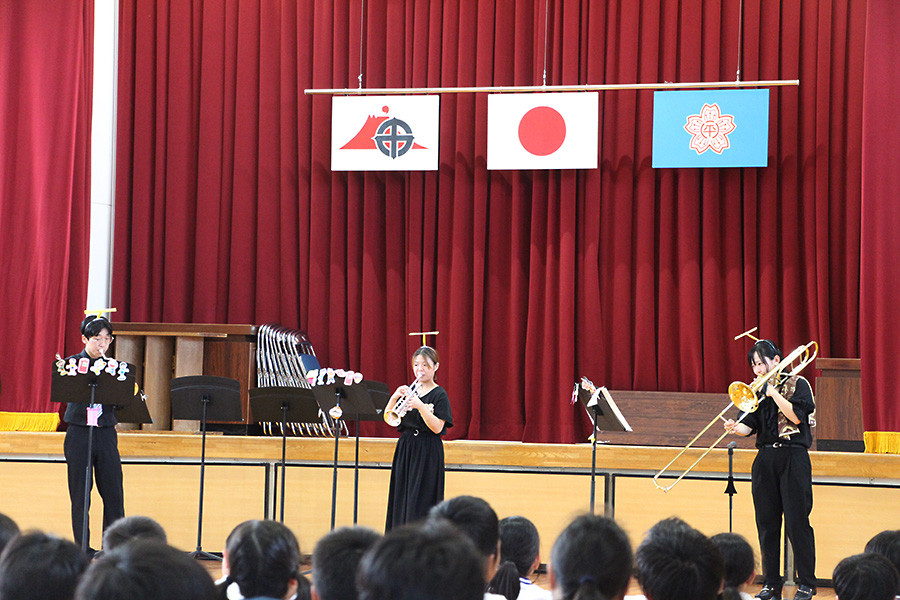 今回は、平川小学校から「ふれあいコンサート」の依頼をいただき、9月9日に音楽学科の学生10名(吉海江花音さん・ソプラノ、甲斐陽和さん・ピアノ、福原モネさん・ピアノ、坂井響さん・トロンボーン、鶴田彩華さん・フルート、樋口純也さん・クラリネット、末廣悠造さん・サクソフォン、村本蘭さん・サクソフォン、井出翔太さん・トランペット、今吉涼花さん・トランペット)と、大学院で音楽を学ぶ学生1名(島中輝士風さん・テノール)の計11名で、音楽の魅力を伝えるさまざまなパフォーマンスを行いました。