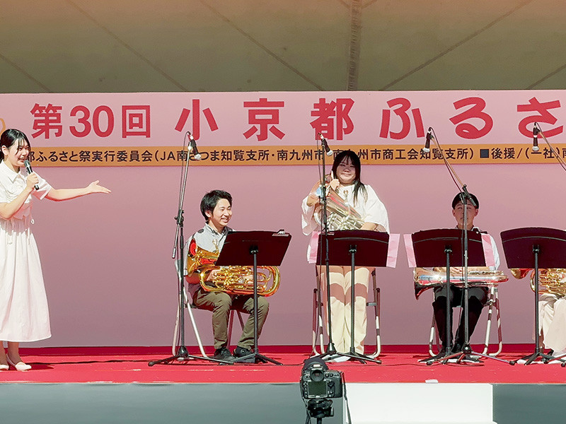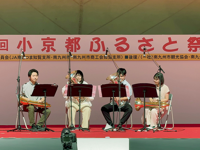 10月26日(日)に知覧平和公園自由広場で開催された「知覧小京都ふるさと祭」にて、音楽学科の学生が演奏を披露しました。この催しでの演奏は今年で3年目となりますが、昨年に引き続き、今年もユーフォニアム四重奏(3年生:上村佳音さん、園田眞歩さん、2年生:勝本遥希さん、1年生:木原悠翔さん)が観客を魅了しました。