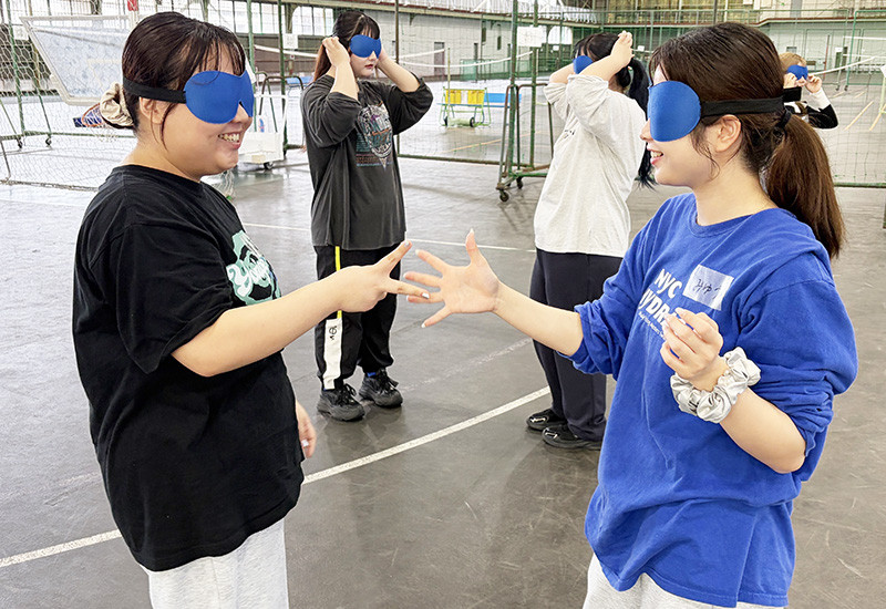中西ゼミ生は、目を隠した状態で相手の指示した動作をとる「ブラインド体操」や目隠しをしたプレーヤーがガイドの指示に従いボールを蹴る「キックゲーム」等、山之内さんの用意した様々なワークを体験した後、中西教授をファシリテーターとするグループワークに挑戦しました。