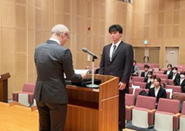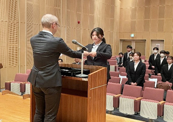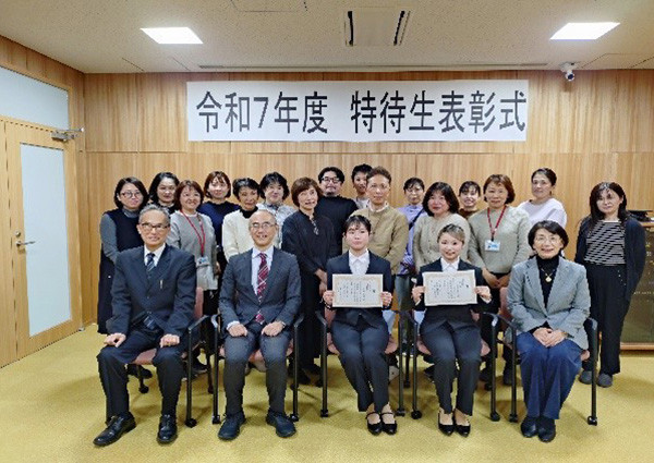 12月9日に令和7年度特待生・特別奨学生(学部留学生)表彰式が視聴覚ホールで行われ、特待生26名(看護学部2名の学生については12月16日に表彰式実施)、特別奨学生9名、特別奨学生(学部留学生)1名及び関係者が出席し、小林学長から代表者へ表彰状が授与されました。