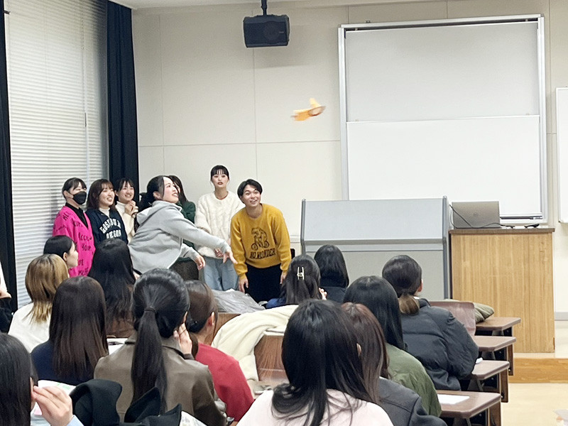 学生からは「保育をしていくうえで子どもたちだけでなく、保育をする側も楽しむことが大切であることが分かった。まずは私たちが楽しむことを忘れないようにしたい。」などの感想が聞かれました。紙飛行機大会を通して福冨先生が教えてくださったのは、一生懸命遊ぶことの喜びと素晴らしさでした。