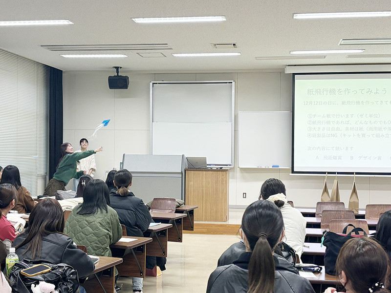 初回は保育の仕事の意義とやりがい、実習生としての心構えなどをお話いただき、学生達は2回目の保育実習に向けてより気を引き締めた様子でした。講話の最後に、先生は宿題を出されました。それは各所属ゼミごとにアイデアあふれる紙飛行機を作成してくることでした。