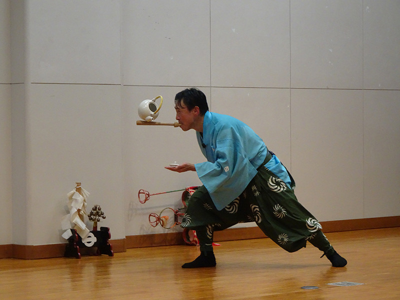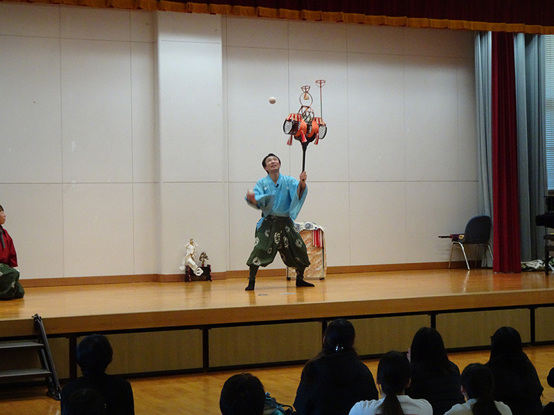 筋の良さを誉められた元脇葵さん(ユーフォニアム3年)は「寿獅子舞と投げ物、花籠鞠、五階茶碗、傘回し等たくさんの曲芸を披露していただき、映像で見る以上の緊張感と迫力にとても感動した。また、分かりやすいように説明を交えながら実演してくださったことで、より一層理解が深まった。拝見できる機会が少ないにもかかわらず、実際に体験までさせていただき、非常に貴重で楽しく、学びのある時間だった」と感激していました。