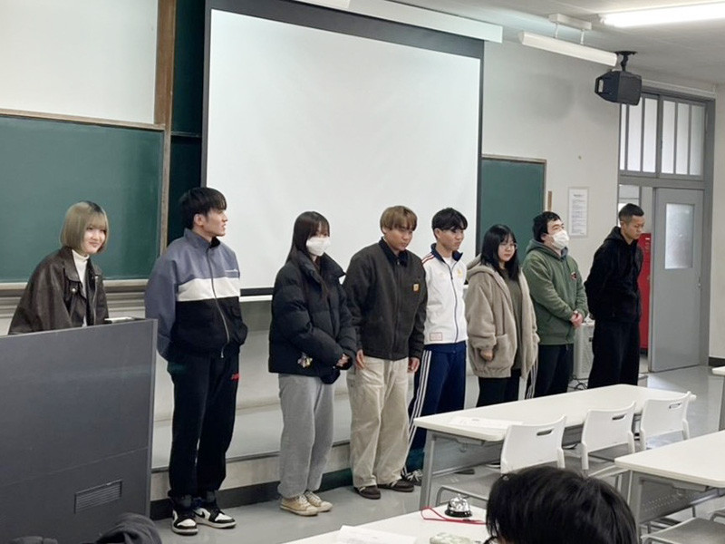 1月22日(木)、経済学科「新入生ゼミナールⅡ」の最終日にプレゼンテーション大会が開催されました。この大会に向けて1年生は各組内でグループに分かれ、自分たちの興味のあるテーマや地域の課題について調査・研究を重ねてきました。当日は、各組の代表グループが1年生全員の前で発表を行い、聴講した1年生・スチューデントアシスタント・教員による投票の結果、次の上位3グループを表彰しました。