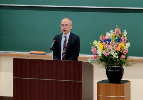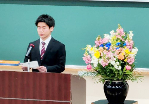 第27代学友会長面髙萌奈さん(児童学科3年)は「競技力の向上だけではなく、仲間と支え合い、努力を続ける姿勢をとおして、多くの人に感動と勇気を与えてくださいました。」と受賞者の方々を称えました。さらに、「前例にとらわれることなく、時代や学生のニーズに合った新たな方法を模索しながら、より多くの学生が充実した学生生活を送ることができるよう、学友会の運営に取り組んでいきます。」と学友会活動への決意が述べられました。続いて、小林学長から「競技だけにかかわらず、音楽活動など様々な場面でも活躍の場を広げられていることを嬉しく思うと同時に、学内で研鑽した成果を学外で十分発揮されたことが誇らしいです。」とお祝いのことばが贈られました。受賞者を代表して鹿子木大地さん(国際文化学科4年)は「指導者や家族に感謝するとともに、大学生活最後の締めくくりとしてこの場を設けてくださった学友会役員にも心から感謝したい。4月からの就職先でもこれまでの経験を活かしていきたい。」と感謝の言葉と今後の抱負を述べました。