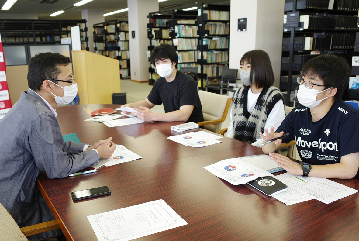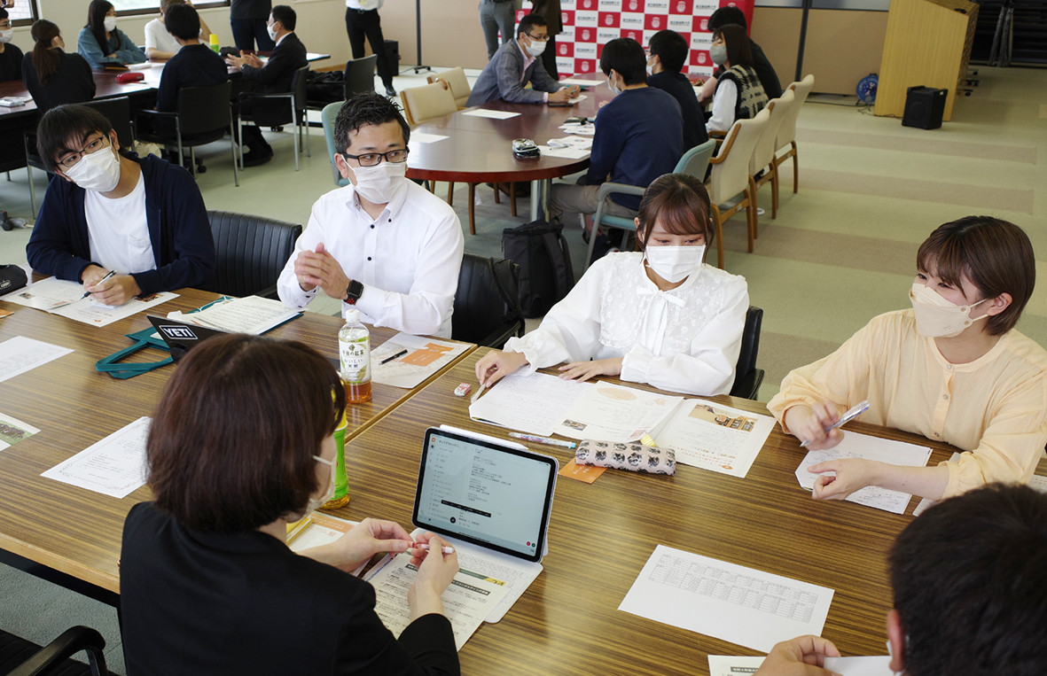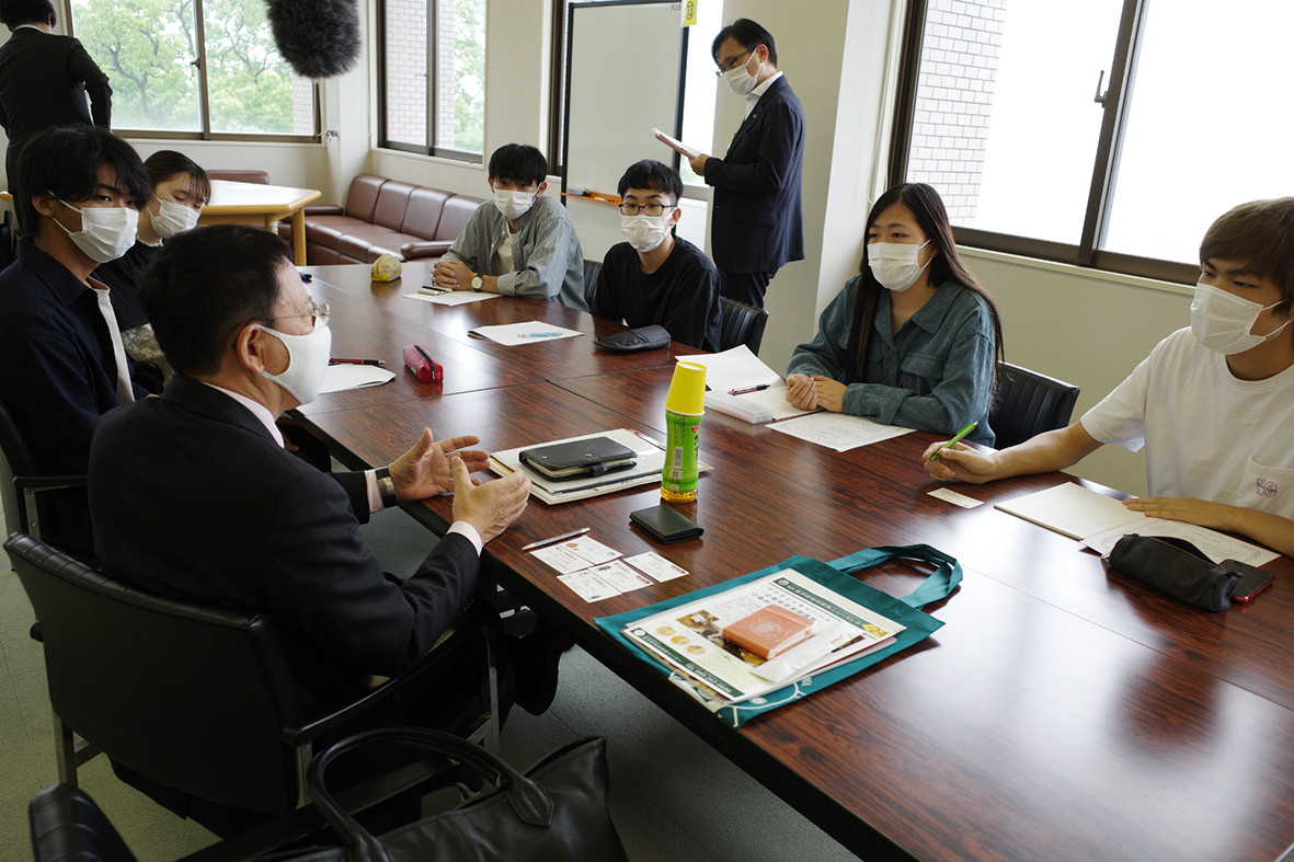 キックオフミーティングでは、初めに本学の大久保幸夫学長が「個店でフィールドワークをさせていただく機会はあまりないことで、学生の貴重な学びになることを期待している」とあいさつ。続いて、鹿児島市産業支援課長の高橋卓也参事が、「この事業は、令和4年度からの新たな企画。企業と学生が交流することで、学生の柔軟な発想に刺激を受け、企業が活性化されるのではと楽しみにしている」と期待を込めました。その後、各企業や学生の紹介がなされ、企業ごとに3グループに分かれて意見交換を行いました。