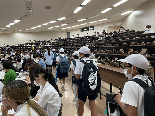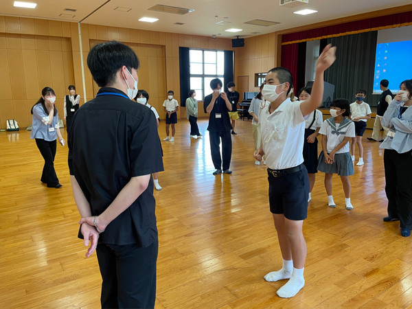 この日のメニューは、中西ゼミ生の案内による学内見学会のほか、大学生とのお食事会、中西准教授による「大学と小学校のちがい」についてのお話、中西ゼミ生主催の交流会と盛りだくさん。見るもの聴くこと、すべてがとてもスケールが大きくて、驚くことばかり。交流会では、普段あまり接する機会のない大学生と一緒にジェスチャーゲーム。みんな、目を輝かせながら、タブレット端末で写真を撮り、大学生の説明を熱心に聴き、汗だくになって遊びました。