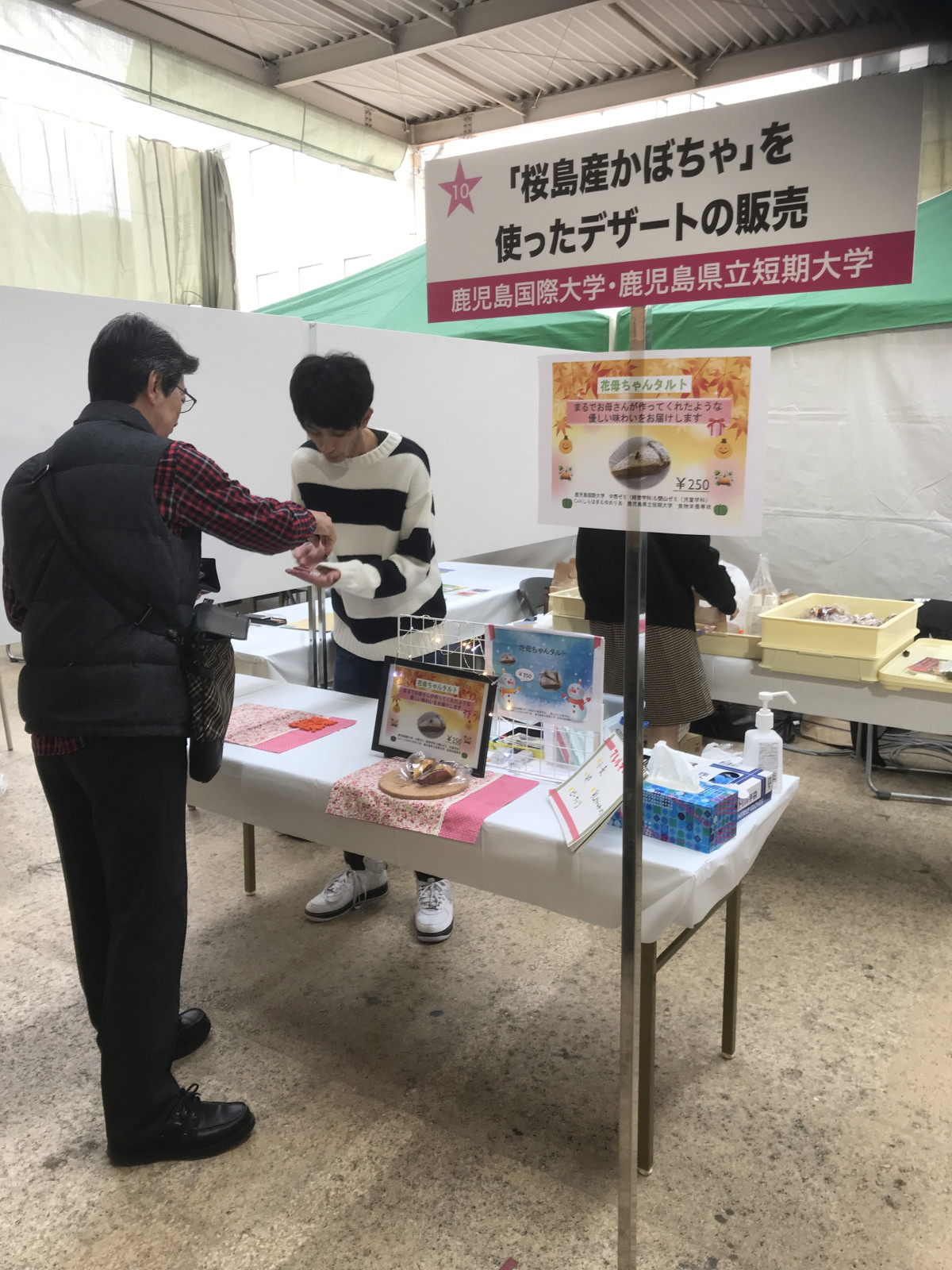 12月1日(土)、経営学科・中西ゼミが、天文館ベルク広場で開催された「第4回かごしま食育フェスタ」に鹿児島県立短期大学と共同出店し、同ゼミが地元企業及び管理栄養士と共同開発した桜島産かぼちゃを用いたデザート「花母ちゃんタルト」の販売会とキッズコーナー「色とりどりのねんどで自分だけのデザートをつくろう!」を開催しました。