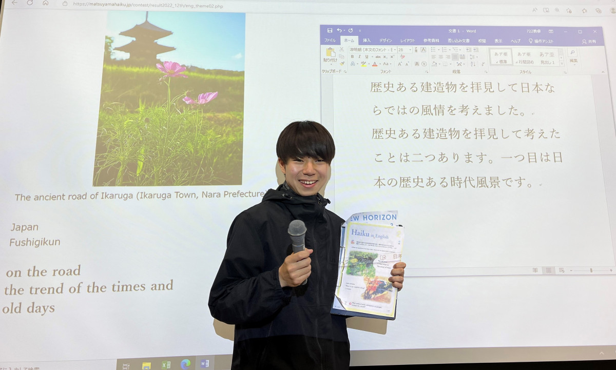 第12回瀬戸内・松山国際写真俳句コンテストが開催され、国際文化学科3年の永仮源久さん(鹿児島中央高校出身)が英語課題句「観光交流都市等部門」で入選しました。写真俳句とは、写真と俳句を組み合わせた表現方法です。同コンテストは例年本学学生が取り組んでおり、本学の入賞者の数は年々増加。応募総数4,312 件のうち、過去最高の 2,483 件が英語で書かれた作品でしたが、今年は永仮さん含む3人が入賞しました。