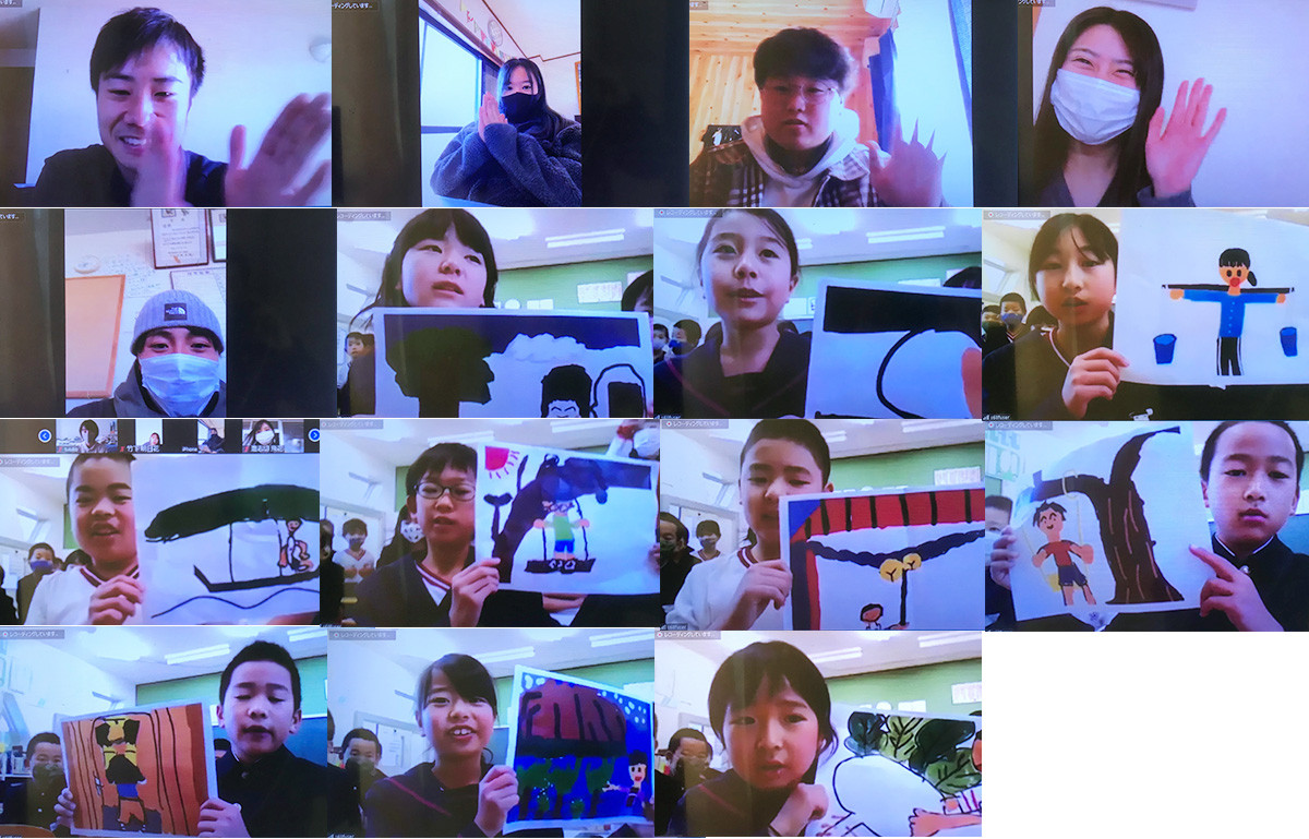 全国的にコロナウィルス禍に見舞われた今年は、小学生の安全と学びの機会の確保を考慮し、Zoomで開催。内容は、小学生が今年度行った「桜島大根の栽培」や「ツバキ油の採集」「新島訪問」などの取り組みについて、Windowsペイントで思い思いに描いた絵を片手に紙芝居形式で説明し、それに対して中西ゼミ生がコメントをつけるというもの。中西ゼミ生はみんな、小学生の元気な発表に対して優しい言葉で一つ一つ丁寧にコメントしてあげていました。