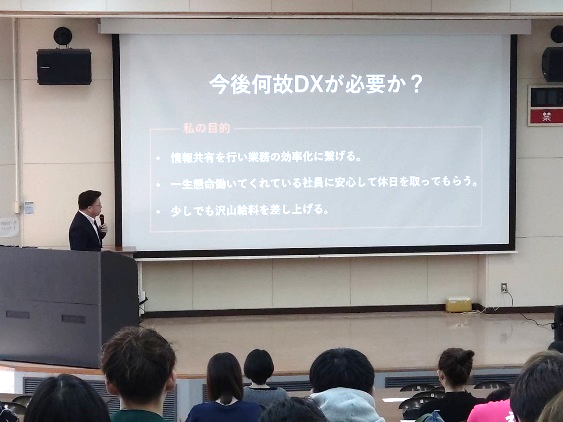 10月19日、経済学部経営学科の独自イベント「経営者が語る会」を開催しました。このイベントは、企業の現状や課題などを学ぶために、鹿児島県内企業の経営者を講師としてお招きし、経営学科1年生を対象にお話をしていただくというものです。10月5日に引き続き、2回目の「経営者が語る会」になります。