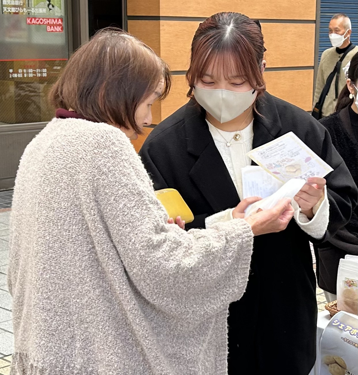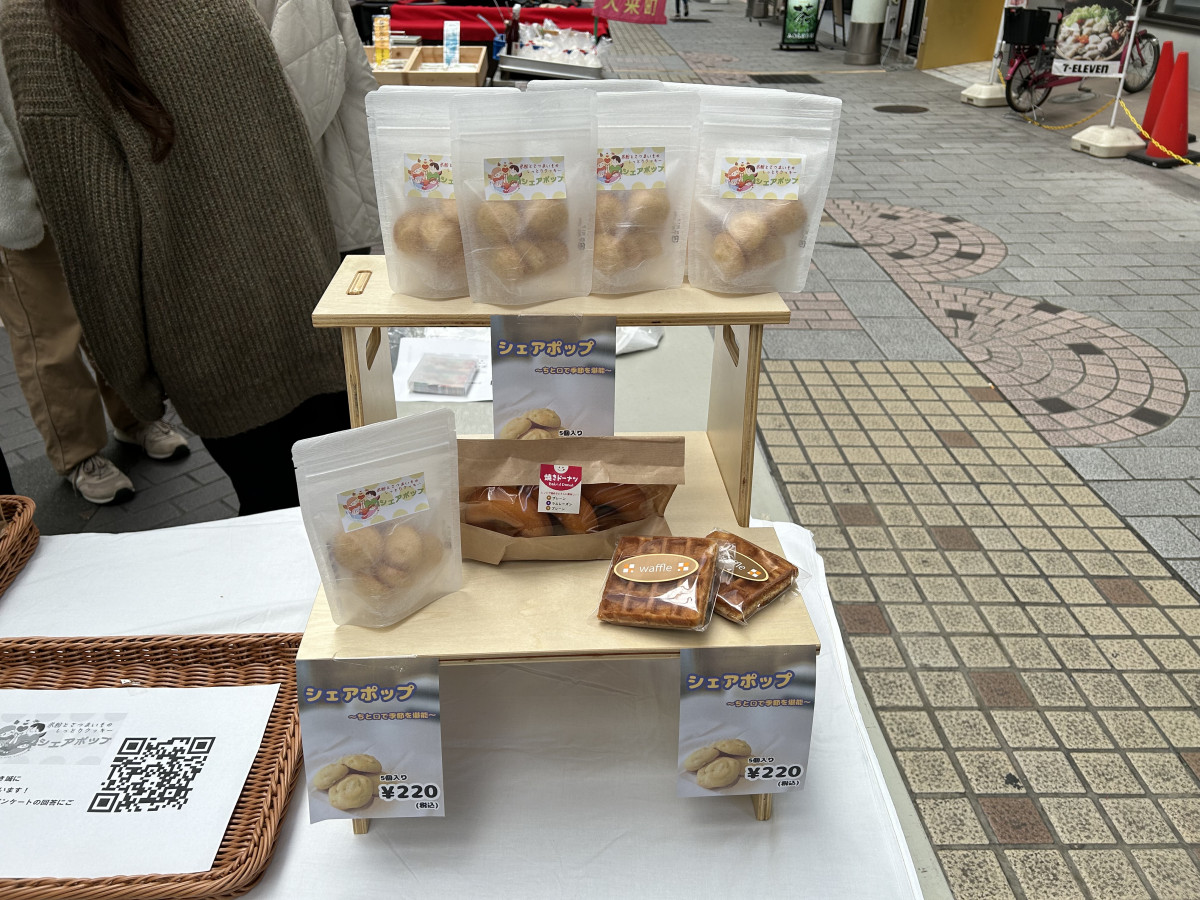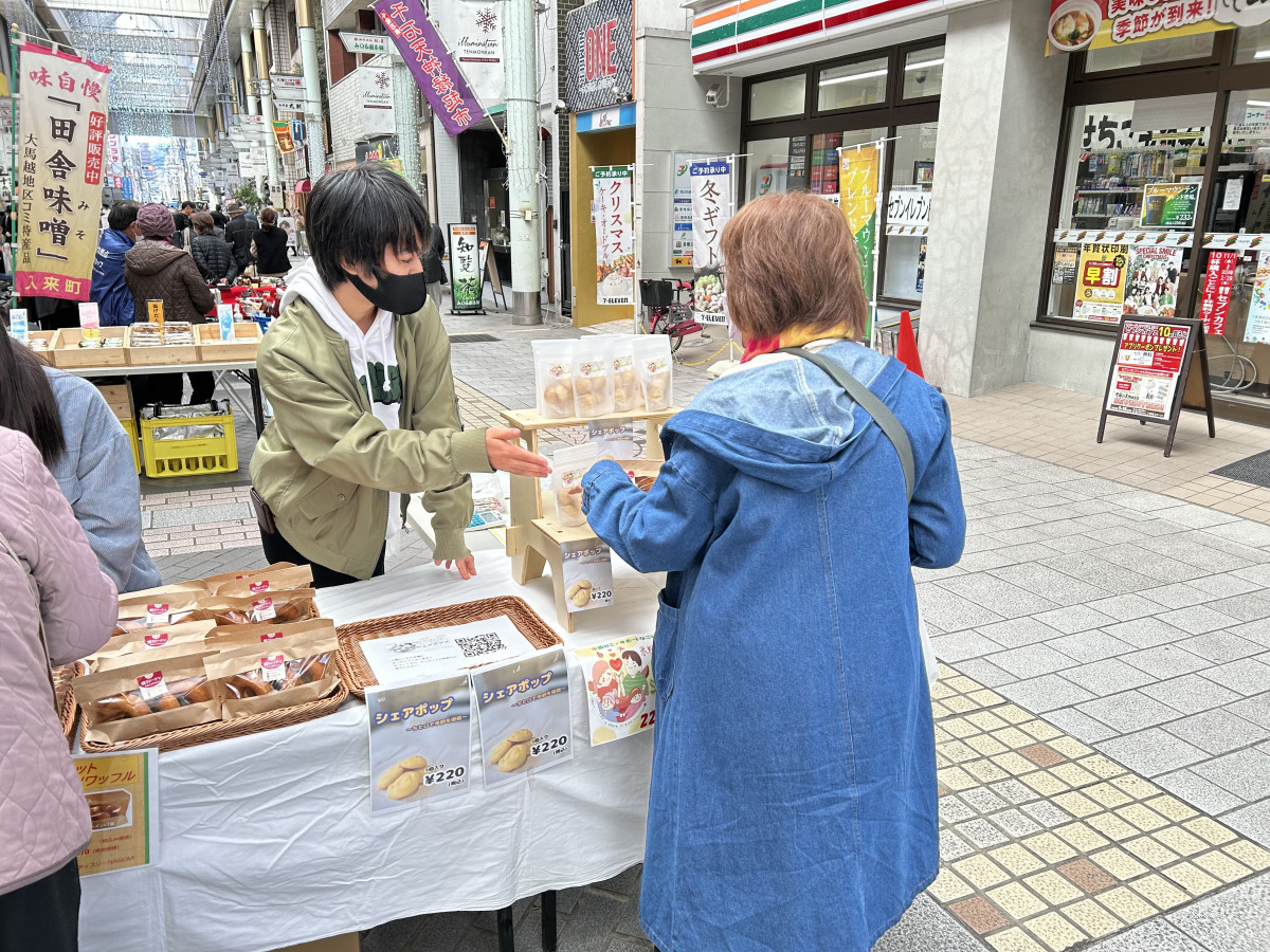 11月25日、経営学科・中西ゼミの2年生24人が、毎月第4土日に天文館ぴらもーるで開催される「千石天神縁起市」に出店。同ゼミが社会福祉法人正和会サポートなごみと共同開発したソフトクッキー「シェアポップ」の販売会を開催しました。