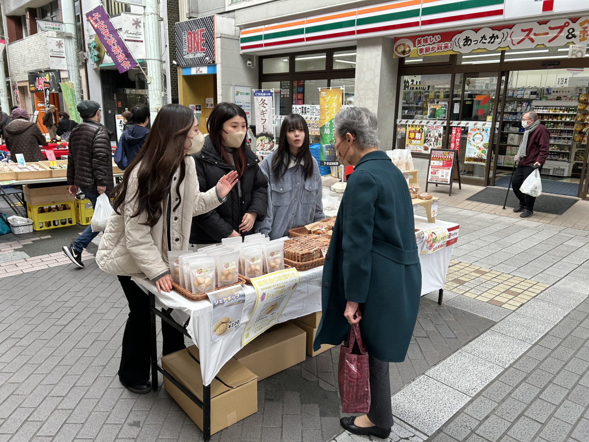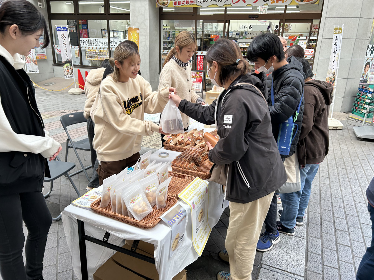 中西ゼミ生は、売り場での販売のほか、商店街内でのチラシ配布と来店の呼びかけ、お買い上げいただいた方へのアンケート等、自分たちの考案した商品を少しでも多くお買い上げいただけるように頑張りました。その甲斐もあり、当日は気温が低く、客足が鈍かったにも関わらず、用意した商品をほぼ全て売り切りました。