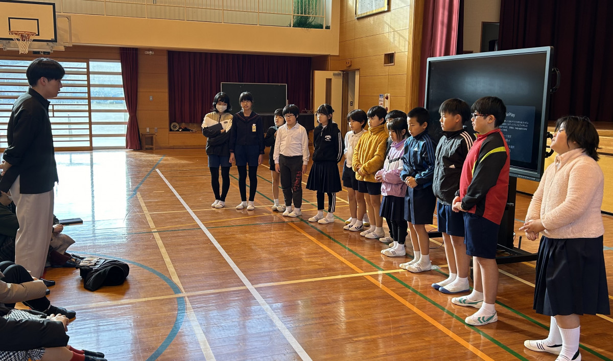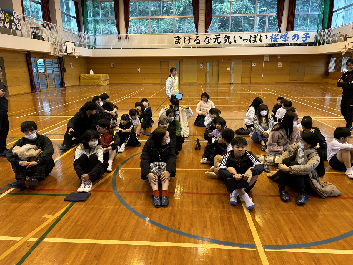 12月1日、経営学科・中西ゼミの4年生13人が、桜島の鹿児島市立桜峰小学校を訪問し、同小学校の子どもたちと交流しました。これは中西ゼミと桜峰小学校の連携による交流イベント「小大連携プロジェクト」の一環として実施されたものです。