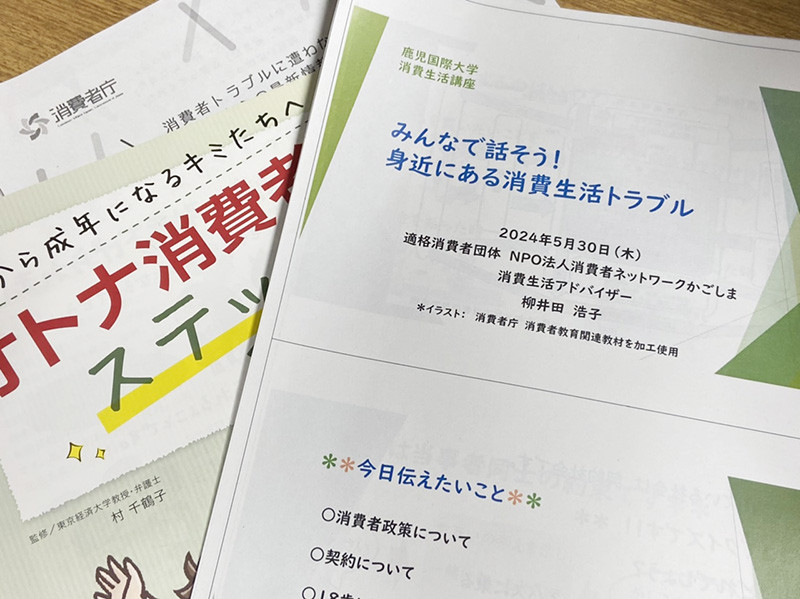 5月30日の「新入生ゼミナールⅠ」は、NPO法人消費者ネットワークかごしまから消費生活アドバイザーの柳井田浩子氏を講師に招いて、「みんなで話そう! 身近にある消費生活トラブル」と題した講座を開催しました。