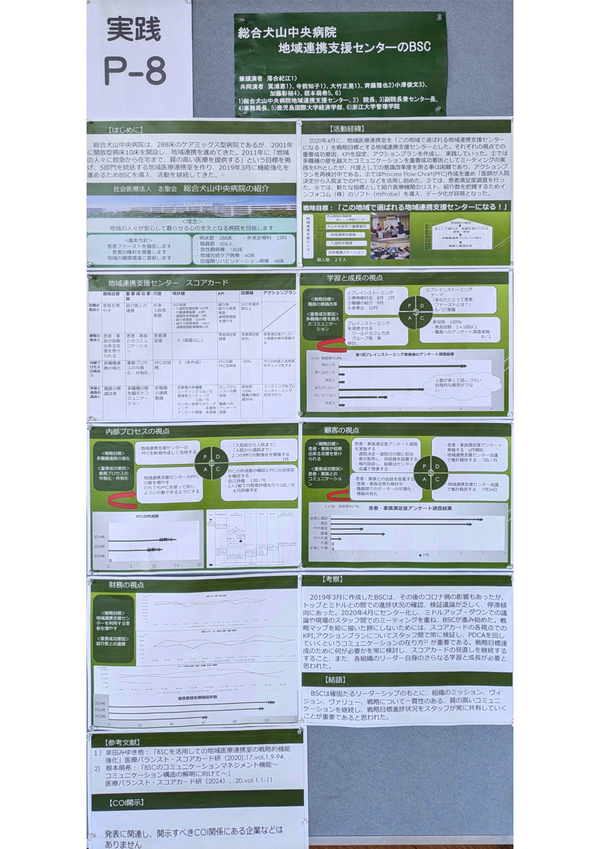 「総合犬山中央病院のBSCの研修は、2018年6月から始め、19年3月には学会本部からファシリテーターをお招きし、ワークショップを行い、病院としてのBSCを作成し、活動してきました。同年11月には第17回学術総会を犬山市で開催するという栄誉をいただき、院内BSC活動は盛り上がっていたのですがコロナ禍が状況を一変させました。23年5月COVID-19が感染症法上の2類から5類に指定され、停滞していたBSCの運用を再開しました。少子高齢化、地域医療構想、コロナ後の受診抑制など、現在どの病院でも大きな課題となっている地域連携活動を推進するため、改めてBSCを使った戦略目標をたて、展開を見直しました。根本先生にもご助言をいただき、コミュニケーションのあり方を再考し、BSC実装を進めてきました。この活動が、第21回医療BSC学会学術総会でポスターアワードを受賞したことは、当院にとって大きな励みであり、スタッフ一同大いに喜んでおります。」