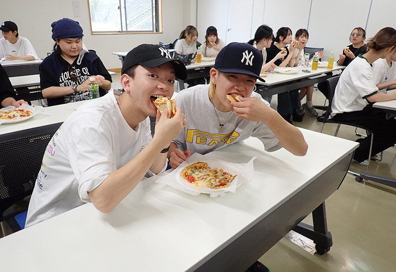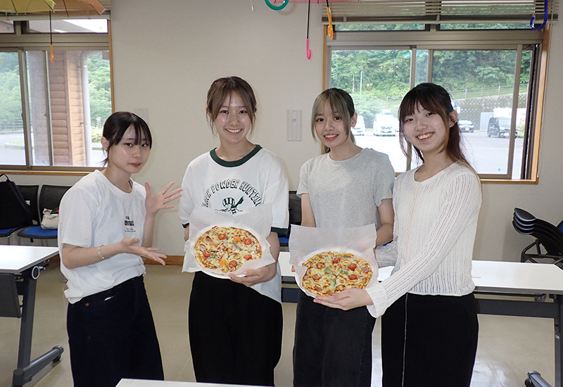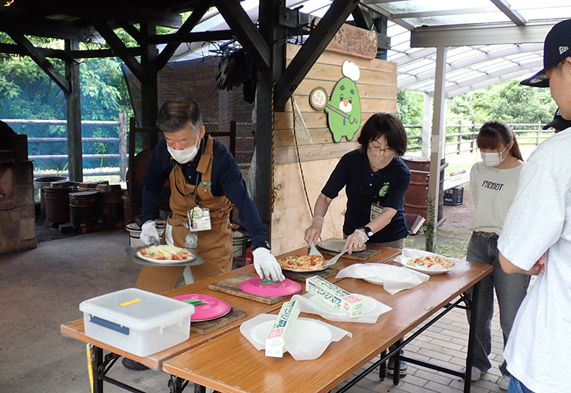 職員の方々との顔合わせの後、石釜ピザ作りを体験しました。生地から手作りし、グリーンファームで収穫された新鮮な野菜を盛りつけて石窯へ。焼きたてならではのピザの味は別格で、グリーンファームの魅力を実感するとともに、農業を観光に活かす視点についても学ぶことができました。