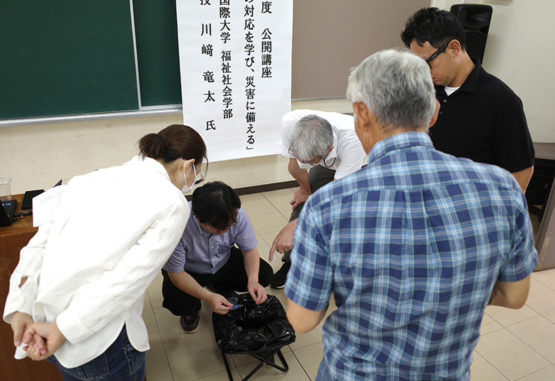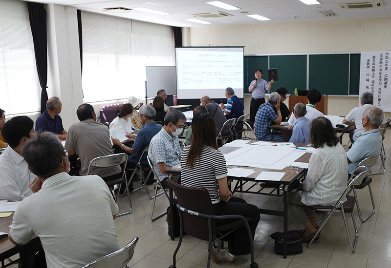6月28日、南九州市と共催にて公開講座「災害時の対応を学び、災害に備える」を開催しました。本学福祉社会学部の川﨑准教授が講師を務め、同准教授のゼミ学生3名と地域住民約20名の方々が参加しました。