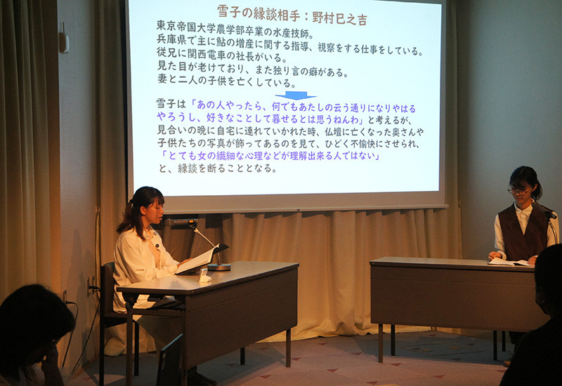 前半は、「谷崎潤一郎・バイオグラフィー」「蒔岡四姉妹(マキオカシスターズ)の物語」「『細雪』を深堀する」の三部に分けて、本学日本近現代文学ゼミナールの学生が発表を行いました。後半は、小林潤司学長に加わっていただいて、ゼミ生を交えて、座談・対談形式で、『細雪』について講演を行いました。