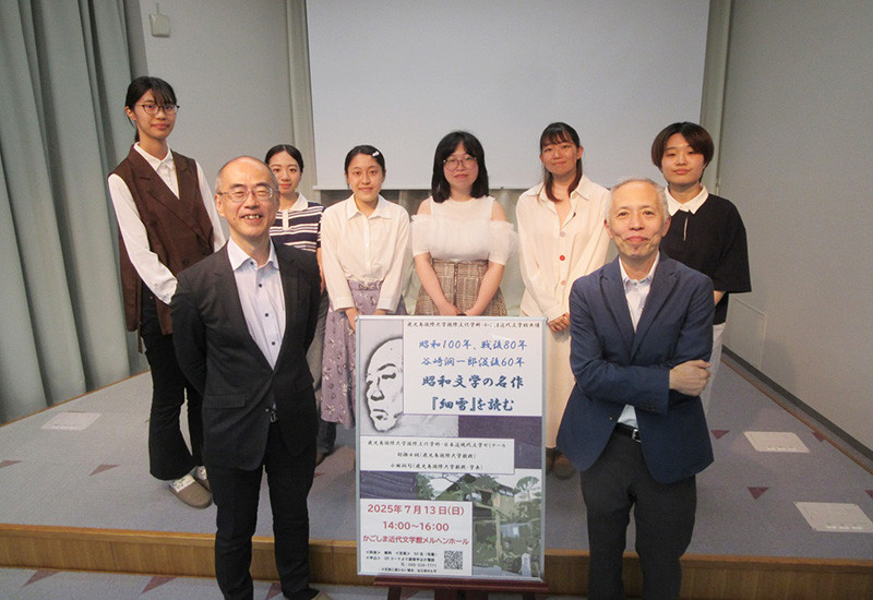国際文化学科の村瀬ゼミ生6名は、7月13日にかごしま近代文学館メルヘンホールで、鹿児島国際大学・かごしま近代文学館共催企画として、「昭和100年、戦後80年、谷崎潤一郎没後60年 昭和文学の名作『細雪』を読む」を開催しました。