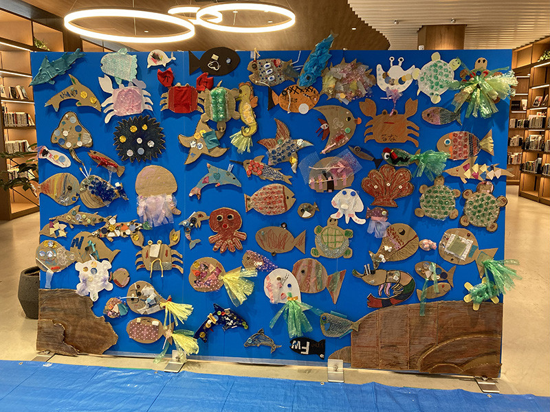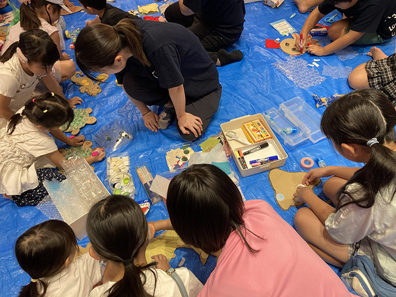 工作アート体験「海の生き物たちを泳がせよう」をイベント名とし、廃材やさまざまな素材を使って、海の生き物を制作し、巨大なアートを来場者のみなさんと完成させました。
