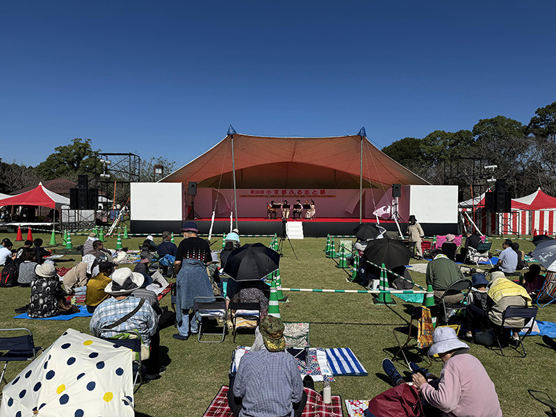 当日は秋晴れに恵まれ、多くの観客でにぎわいました。学生の演奏は午後のステージのトップバッターとして行われ、事前に音響チェックのほか、風対策や日差しへの備えを現地スタッフとともに入念に行い、本番に臨みました。プログラムは、四重奏3曲(《ガラスの香り》《パート・オブ・ユア・ワールド》《夏色》)とデュオ1曲(《ホール・ニュー・ワールド》)の計4曲で構成。上田和音さん(3年生・声楽コース)によるMCを交えながら、約20分間にわたって演奏しました。