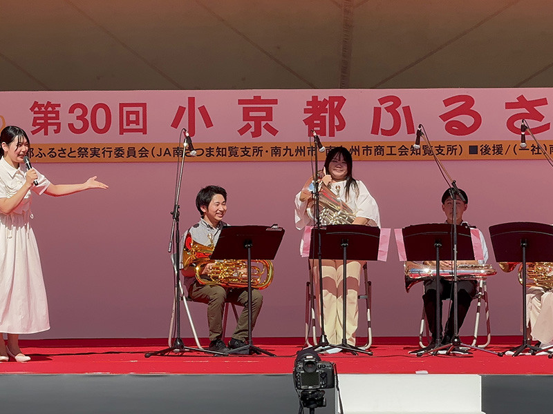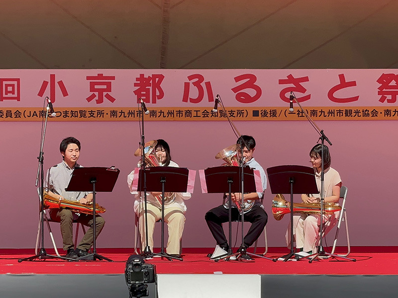 音楽学科の伊藤ゼミ生5名が、10月26日に知覧平和公園自由広場で開催された「知覧小京都ふるさと祭」にて、演奏しました。この催しでの演奏は今年で3年目となり、昨年に引き続き、ユーフォニアム四重奏(3年生:上村佳音さん、園田眞歩さん、2年生:勝本遥希さん、1年生:木原悠翔さん)を披露し観客を魅了しました。