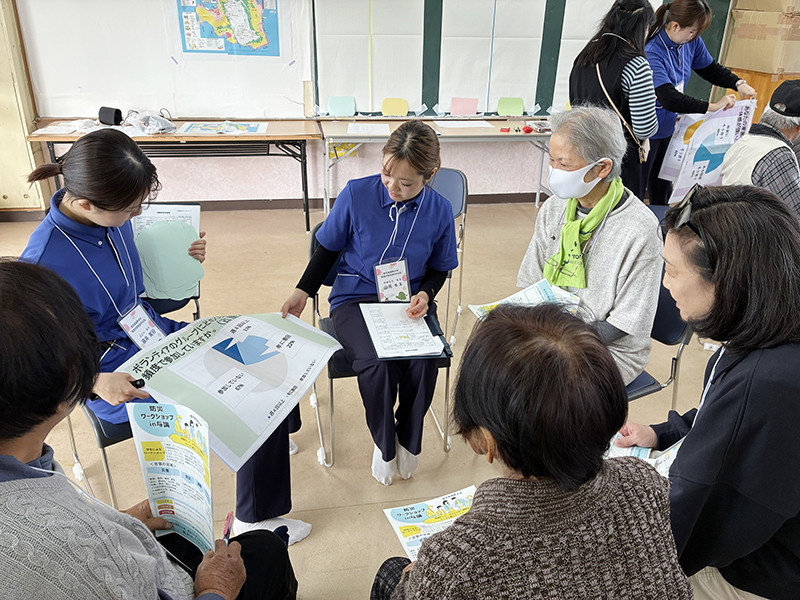 後半は、看護学部の学生4人によるワークショップを実施。参加者を那間地区と古里地区の2グループに分け、①地域の特性や強み、②避難時の不安や困りごと、③避難時にできそうな助け合いのあり方の3つのテーマについて意見交換を行いました。